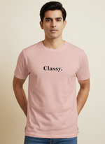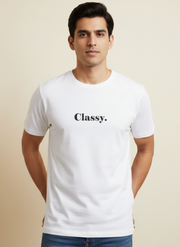 The "Classy." Printed Crew-Neck T-Shirt is the perfect combination of minimalism and sophistication. This men's casual fit tee is crafted from soft, breathable cotton, ensuring comfort for all-day wear. The standout feature is the bold "Classy." text printed in black typography across the chest, making a subtle yet impactful statement.