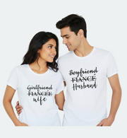 Made from soft, breathable fabric, these white t-shirts provide comfort and style, perfect for casual wear. Their simple yet impactful design makes them ideal for special occasions or just an everyday reminder of your relationship milestones. With this "Girlfriend, Fiancée, Wife" and "Boyfriend, Fiancé, Husband" matching couple set, you’ll celebrate your love in a unique and memorable way.